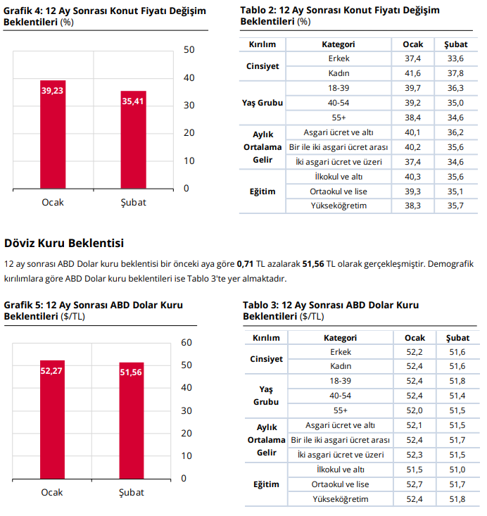 Gelecek 12 ay sonunda konut fiyatlarının artış beklentisi bir önceki aya göre 3,82 puan azalarak yüzde 35,41 oldu. Demografik kırılımlara göre konut fiyat değişim beklentileri tablolarla detaylandırıldı.