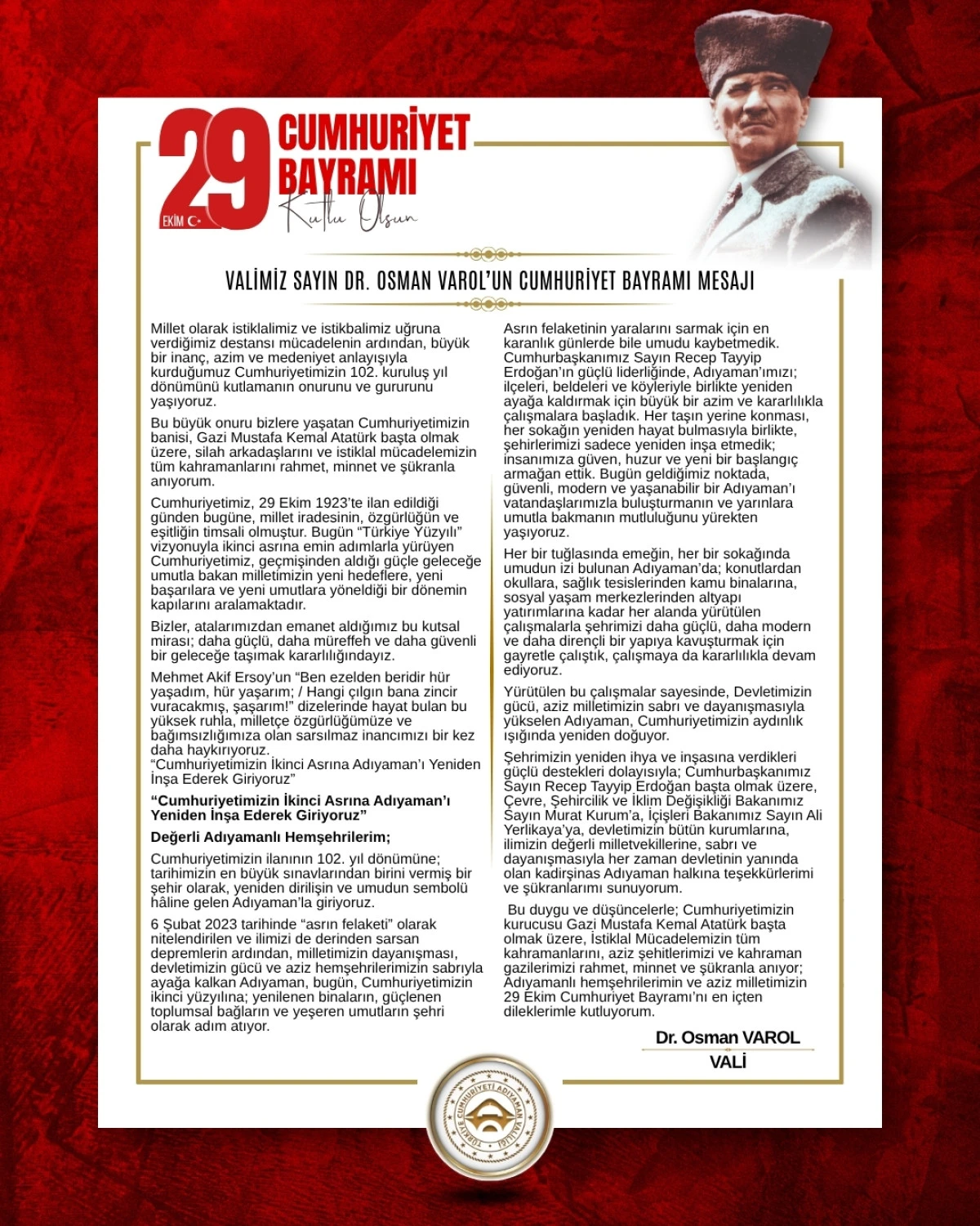 Cumhuriyetimizin ilanının 102. yıl dönümüne; tarihimizin en büyük sınavlarından birini vermiş bir şehir olarak, yeniden dirilişin ve umudun sembolü hâline gelen Adıyaman’la giriyoruz.