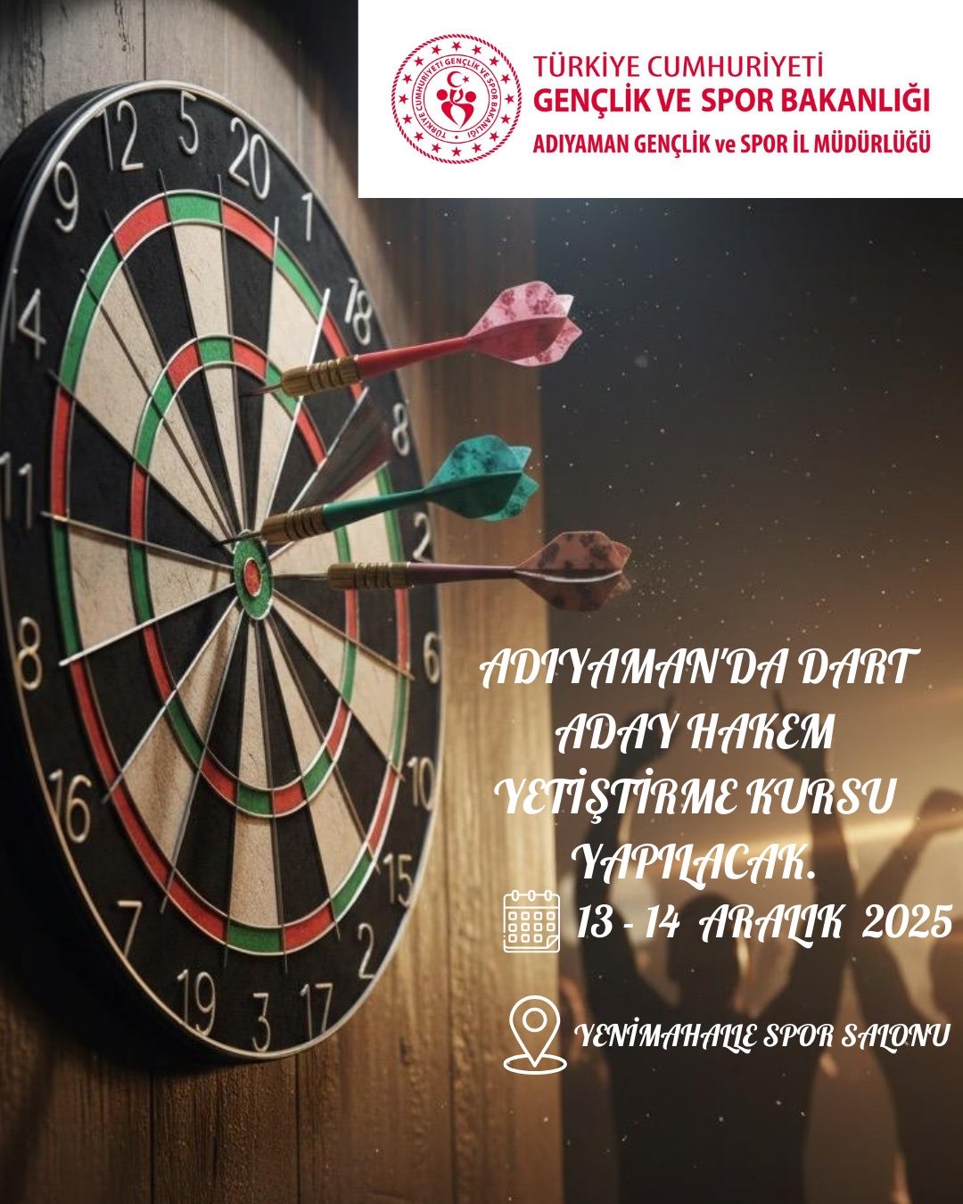 Adıyaman Gençlik ve Spor İl Müdürlüğü, 6-7 Aralık ve 13-14 Aralık 2025 tarihlerinde Bocce ve Dart branşlarında Aday Hakem Yetiştirme Kursları düzenliyor. Kurslar Yenimahalle Spor Salonu’nda gerçekleştirilecek. Katılım için başvurular açıldı!