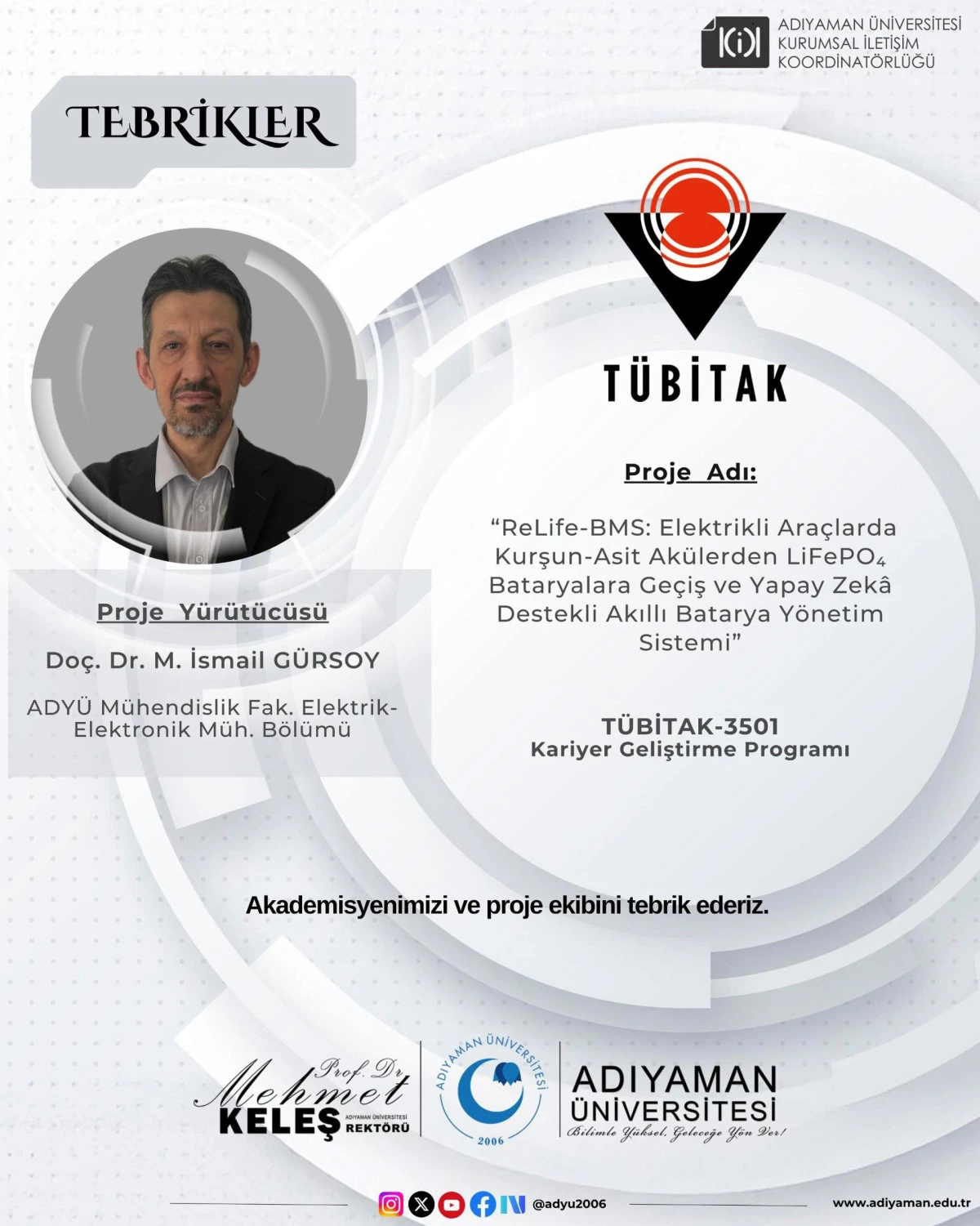 Adıyaman Üniversitesi Elektrik-Elektronik Mühendisliği öğretim üyelerinden Doç. Dr. M. İsmail Gürsoy’un yürütücülüğünü üstlendiği, Prof. Dr. Seydi Vakkas Üstün’ün danışman, Doç. Dr. Mehmet Büyük’ün ise araştırmacı olarak yer aldığı “ReLife-BMS: Elektrikli Araçlarda Kurşun-Asit Akülerden LiFePO₄ Bataryalara Geçiş ve Yapay Zekâ Destekli Akıllı Batarya Yönetim Sistemi” başlıklı proje destek almaya hak kazandı.
