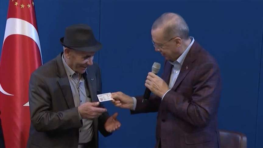 Öte yandan, takdimde bir vatandaş, Cumhurbaşkanı Erdoğan'dan aldığı kimlik kartını öpüp alnına koydu. Cumhurbaşkanı Erdoğan ise elini öpen bir kız çocuğunu öpüp kimlik kartını verdi.