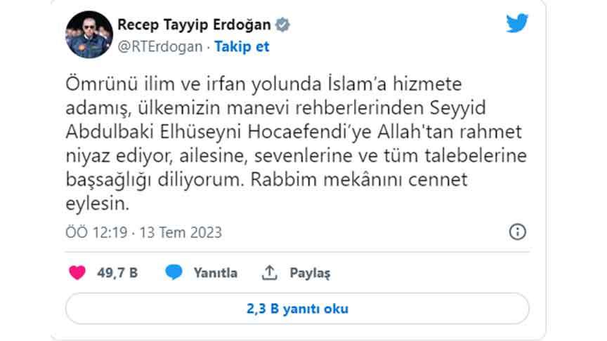 Cumhurbaşkanı Recep Tayyip Erdoğan Dün Hayatını Kaybeden Menzil Şeyhi Abdülbaki El Hüseyni için taziye mesajı yayınladı. Erdoğan yayınladığı mesajda