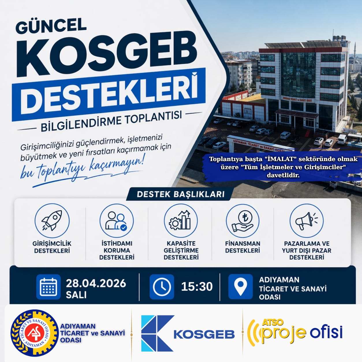 Adıyaman Ticaret ve Sanayi Odası’nda 28 Nisan 2026 Salı günü düzenlenecek toplantıda, KOSGEB’in güncel destek programları hakkında işletmelere ve girişimcilere bilgilendirme yapılacak.