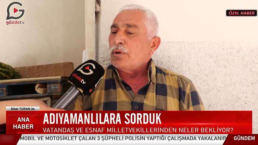 Adıyaman milletvekillerinden ne bekliyorsunuz? Sorusunu cevaplayan bir vatandaş, “ Adıyaman milletvekili beklediğimiz çarşıya gelsinler. Milletin derdiyle dertlensinler. Millet neyin içinde tozun, toprağın, sıcağın hiçbir şey gelişmiyor. Hiçbir kimse bir şey yapamıyor. Millet acından ölecek. Bu neyin nesidir? Bu nedir? Biz bunu bekliyoruz. Neredeler? Buyurun neredesiniz? Gelin çarşıya bir gel bir milletin derdine bir sorun ya bakalım. Millet neyi istiyor? Millet neyin peşinde? Siz neyin peşindesiniz? Bir gelin bakın. Sorun. Siz milletvekili olmuşsunuz. Milletin vekilisiniz yani. Gelin bakın benim sorunum nedir? Kimse milletvekili tanımıyor ki gelsin buraya, ben tanımıyorum. Çünkü bilmiyoruz. Kim bizim milletvekili olduğumuzu? Bilmiyoruz. Tabii tek bir tane tanıdığımız Milletvekili var, onu şahsen tanırız. Başka hiçbirini tanımıyoruz. Kimdir, neyin nesidir? Adıyaman milletvekili, tamam millet de gitmiş orada oturmuş milletin derdiyle kimse ilgilenmiyor. Nedir derdiniz? Siz eviniz yıkılmış, yapılıyor mu? Yapılmıyor mu? Sizlere ev verilecek mi? Kaç liraya verecek? Nerede verecek? Gençlere gençler hep perişan. Sanayi yok, dükkân yok, iş yeri yok. Hiçbir şey yok. Vallahi sonuçta işte isteğimiz bu. Gelsinler bizimle bir görünsünler bakalım. Biz ne istiyoruz? Bizim sıkıntımız, derdimiz nedir?” ifadelerini kullandı.